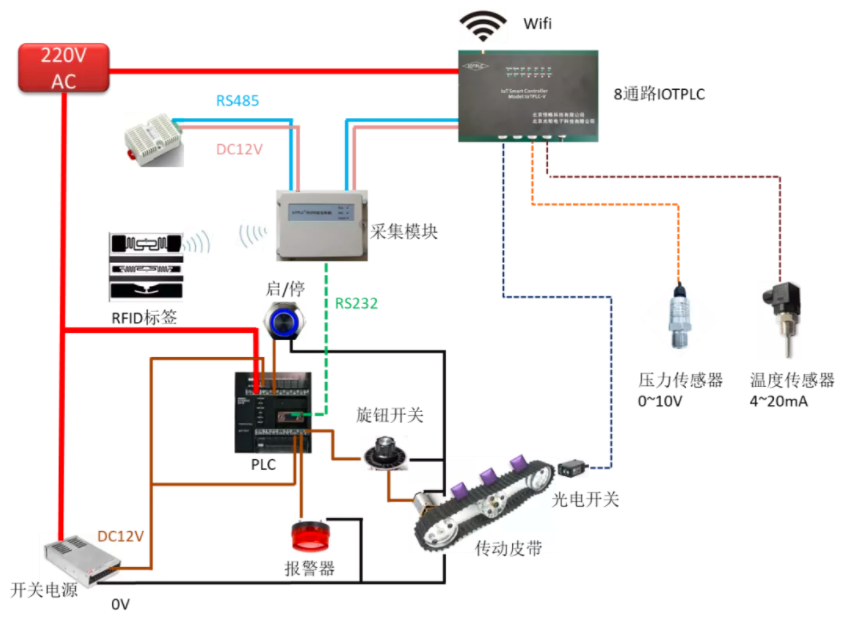主要包括了便攜裝備箱子、平板電腦PAD、硬件主控電路系統(tǒng)等,其中硬件主控電路系統(tǒng)主要包括PLC控制器、模擬工廠電機(jī)傳送裝置、電機(jī)開關(guān)、電機(jī)調(diào)速器、壓力傳感器、溫度傳感器、溫濕度變送器、報警器、4G隨身路由器、RFID射頻標(biāo)簽、8通路主控電路板、FRID定位終端電路板等。